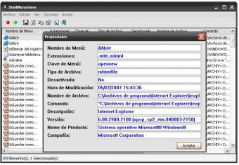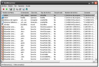 ShellMenuView, por otro lado, carga todos los elementos del menú contextual en una tabla que muestra el nombre del ítem, la extensión de fichero asociada, la acción y la ruta del ejecutable. ShellMenuView puede desactivar o volver a activar las entradas seleccionadas, así como abrirlas en el editor de registro o copiarlas como una fila de texto.
